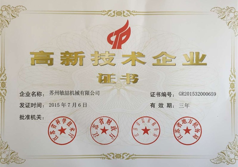 蘇州敏喆高新企業證書